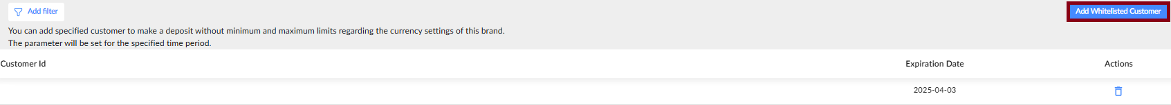- Click the Remove icon next to a customer's entry to delete them from the whitelist. Confirm your action.