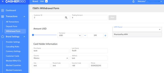 The Withdrawal Form for the B2B Cashier is available in CRM360, allowing back-office users to create and process customer payout requests.