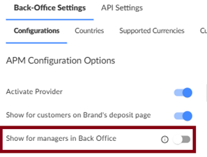 The Withdrawal Form flow is available only for payment providers that support withdrawals and have an existing integration in place. To ensure the provider has access to the Withdrawal Form, the Show for managers in Back-Office toggle should be enabled.